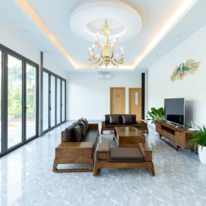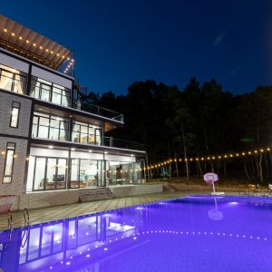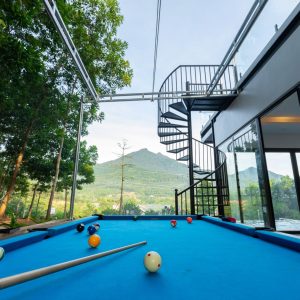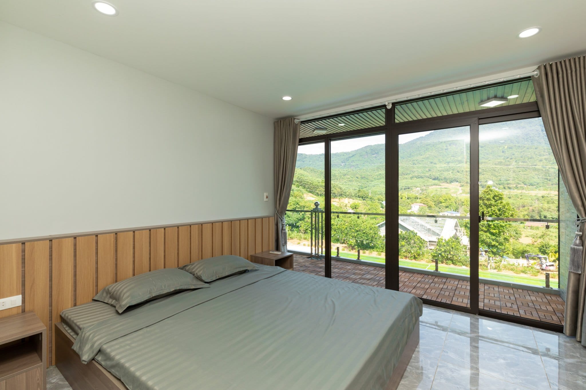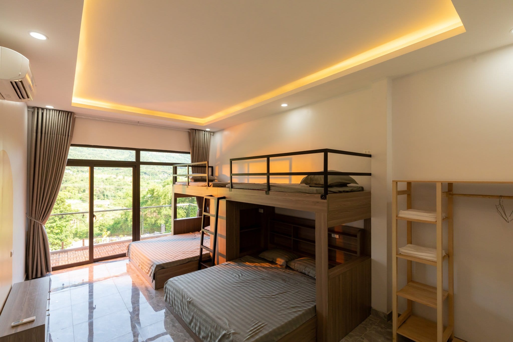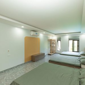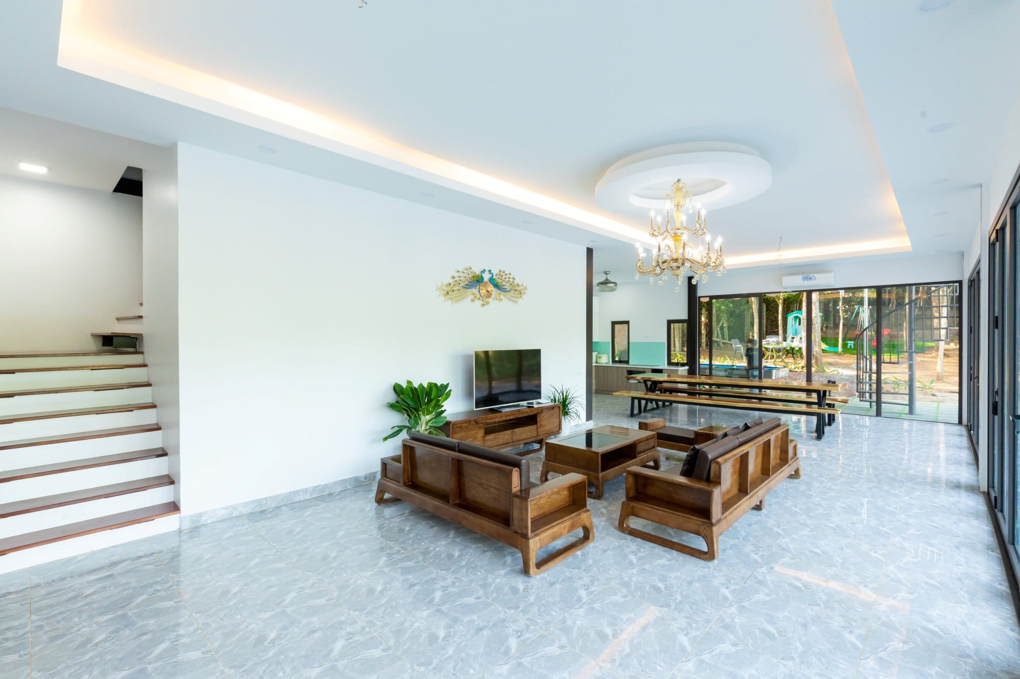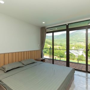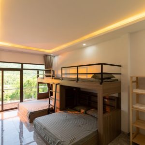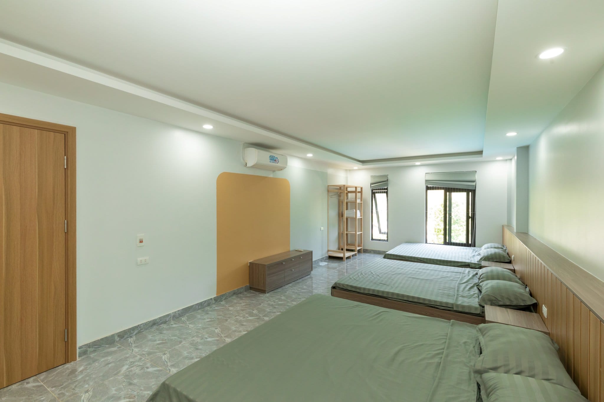 – Nhà villas 3 tầng diện tích tầng 1 là 140m2, tổng diện tích sàn trên 400m2. Có 07 phòng ngủ được trang bị đầy đủ điều hòa 02 chiều hàng nội địa Nhật, vệ sinh khép kín, trong đó 03 phòng tập thể, 03 phòng đơn và 01 phòng dành cho quản gia trông nom khu nghỉ dưỡng. Tiêu chuẩn theo giường ngủ của các phòng là 22 khách. Kê thêm đệm phụ thì được tối đa 40 khách.