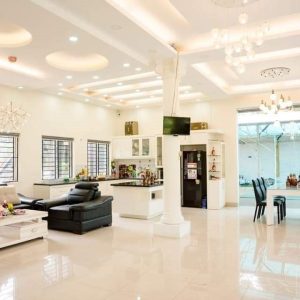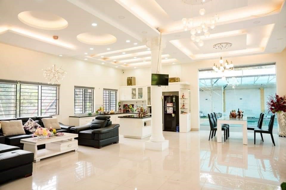 + Khu nhà chính : phòng khách 100 m2 không gian mở, thông liền phòng bếp với đầy tiện nghi .